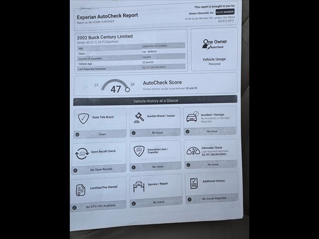 A 2002 Buick Century with the Custom Limited trim package with the solid 3.1L V6 engine and automatic transmission, dual front air bags, power windows, locks, and power heated mirrors, cruise control with tilt steering wheel with controls, automatic air conditioning and climate control, compass and temp, Onstar, auto dimming rear view mirror, automatic headlights, am/fm/cassette and single CD player stereo, Monsoon II premium sound system, remote keyless entry with panic and trunk release, 6 passenger leather interior with DUAL power seats and lumbar, rear window defroster, ABS brakes, and factory silver alloy wheels. Just spent $ in our shop making this car close to perfect! Sure those fancy showrooms are nice, but YOU pay for that.....Come to Hinton Chevrolet where the REAL deal is AT!!! Non Commissioned Sales Staff! Shipping options for out of state purchases! We take anything in on trade!